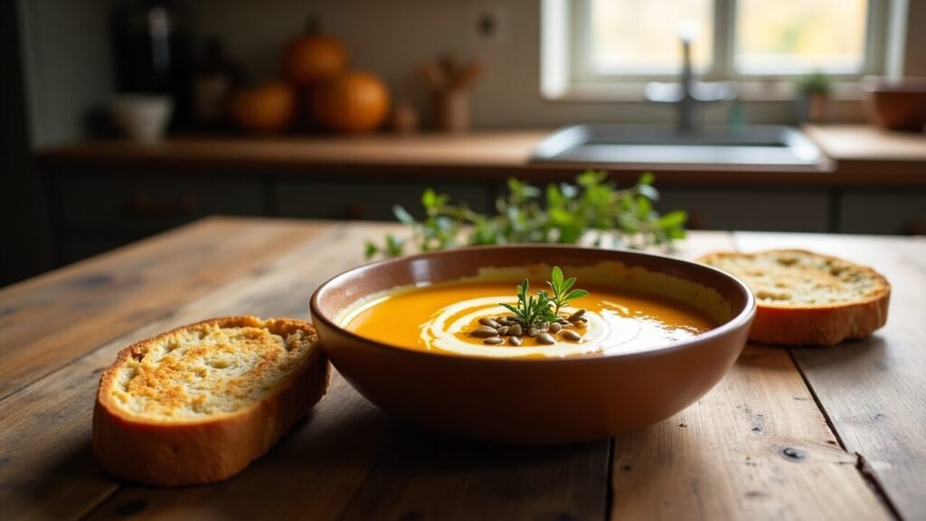Ladle into bowls and garnish with a drizzle of cream, roasted pumpkin seeds, and fresh thyme. Serve warm with crusty bread or garlic toast.
