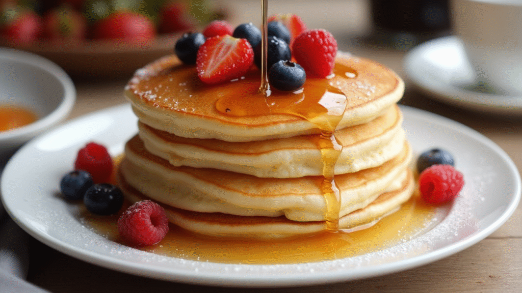 Serve the pancakes warm with your favorite toppings—whether it’s butter, maple syrup, fresh berries, whipped cream, or a dusting of powdered sugar.