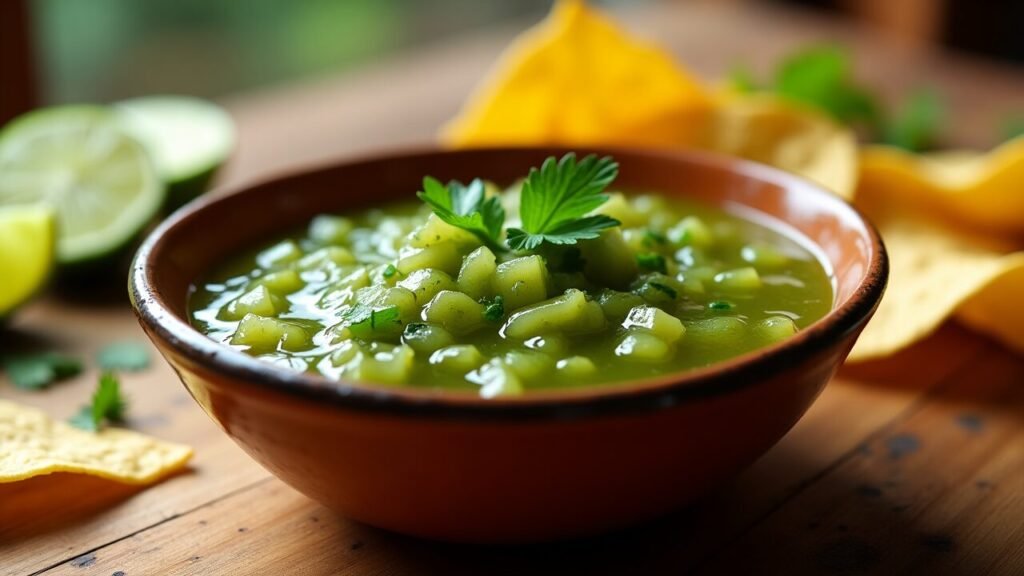 Salsa verde, or green salsa, is a zesty, tangy, and fresh Mexican condiment that instantly brightens any dish. Made with roasted tomatillos, fresh herbs, and a hint of heat from chilies, it’s perfect for tacos, grilled meats, eggs, or simply as a dip with tortilla chips.