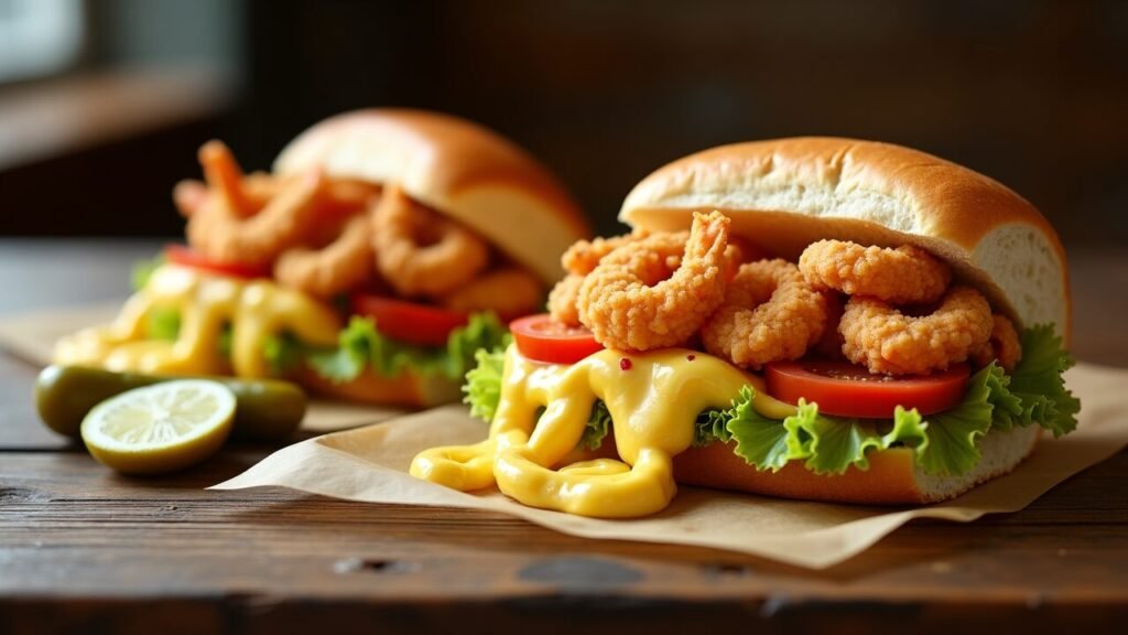Step 8: Assemble the Po’ Boys (5 minutes) Spread a generous layer of remoulade sauce on both sides of each bread loaf. Layer the bottom with shredded lettuce, then pile on the hot fried shrimp – don’t be shy, these should be generously filled. Top with tomato slices and close the sandwich. The key is working quickly while the shrimp are still hot and crispy. Cut each sandwich in half diagonally for easier eating and better presentation.