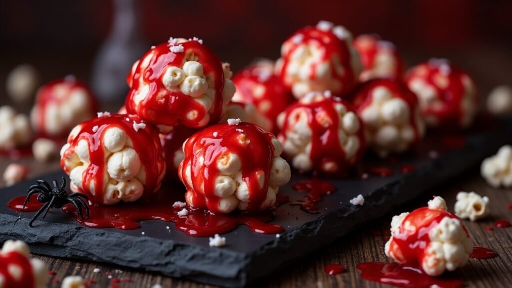 Form the popcorn balls up to 1 week ahead and store covered at room temperature – they actually improve in texture over the first day or two. However, apply the blood effects only on the day of serving, ideally 2-4 hours before the party, to maintain the glossy, wet appearance that makes them most effective.