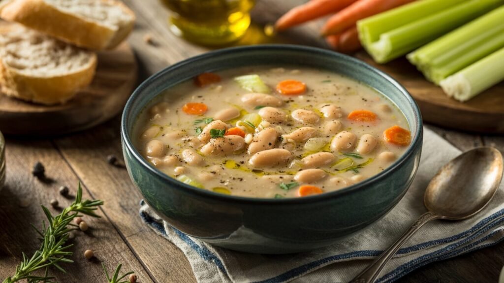 The tender white beans (like cannellini or navy beans) simmer gently with aromatic vegetables, herbs, and a splash of olive oil, creating a soup that’s naturally creamy without needing heavy cream.