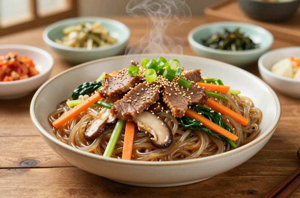 Japchae can be served warm, at room temperature, or even cold. It pairs well with steamed rice and simple side dishes like kimchi or cucumber salad.