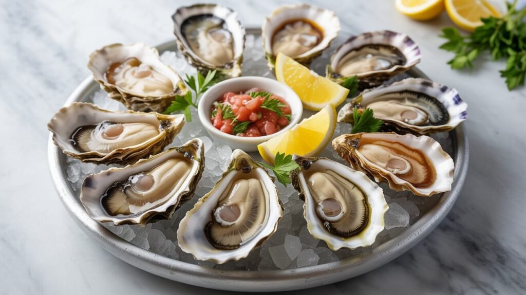 - Fresh Live Oysters (1–2 dozen) – Choose cold-water varieties like Blue Point, Kumamoto, or Malpeque for the best briny flavor. Always select oysters that are tightly closed.