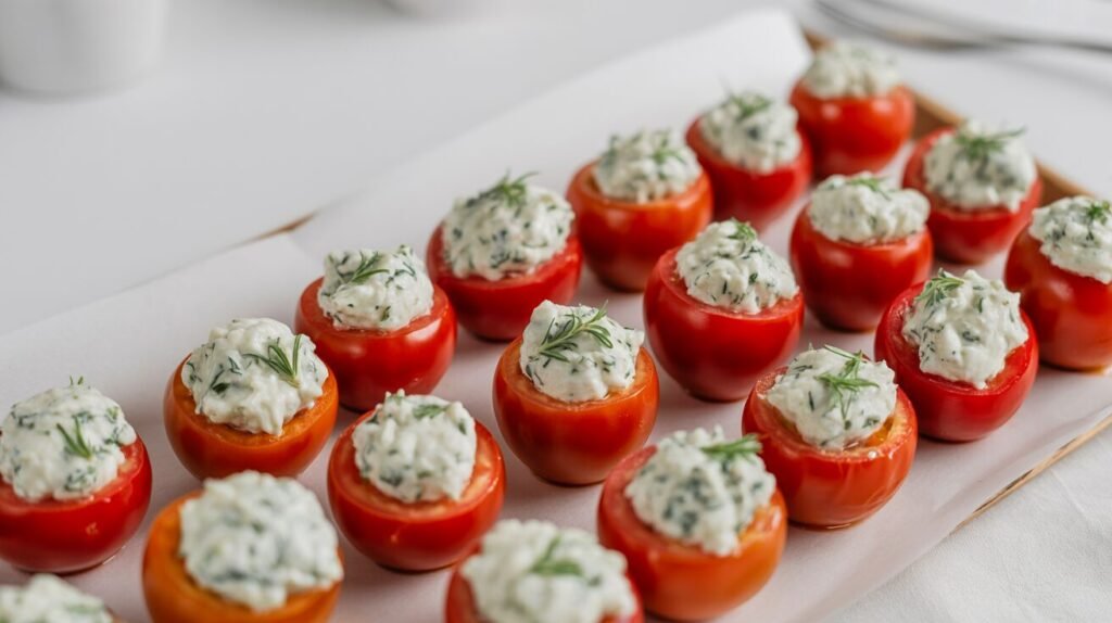 The beauty of this recipe lies in its simplicity. Fresh cherry tomatoes are hollowed out and filled with a creamy, savory mixture made from cheese, herbs, and seasoning. They’re light, refreshing, and customizable—so you can adapt them to suit your flavor preferences or the theme of your event.