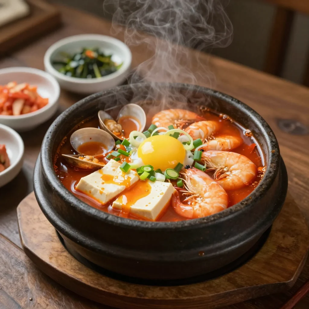 This stew is commonly served bubbling hot in a stone pot, often finished with a cracked egg that gently cooks in the heat of the broth. Served alongside steamed rice, it becomes a complete and comforting meal.