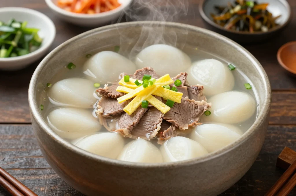 Tteokguk is one of the most comforting and meaningful soups in Korean cuisine. It’s a clear, savory soup made with soft rice cakes simmered in a light beef broth and finished with simple garnishes. The texture is gentle, the flavor is clean, and the dish feels warm without being heavy.